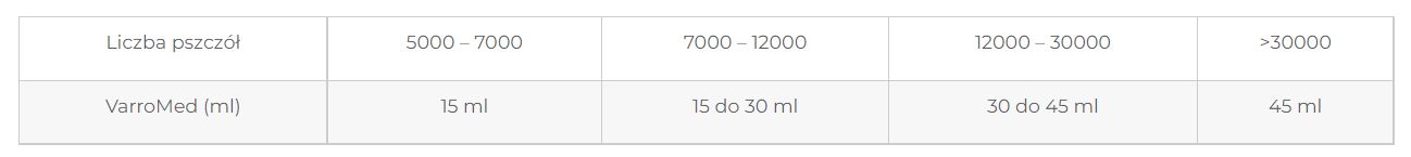 Agitați înainte de utilizare. Doza trebuie ajustată cu atenție la dimensiunea coloniei de albine (a se vedea tabelul de dozare). Determinați dimensiunea coloniei de albine și numărul de spații ocupate de albinele care urmează să fie tratate, apoi selectați cantitatea de produs necesară. Utilizați următoarea schemă de dozare în conformitate cu tabelul: