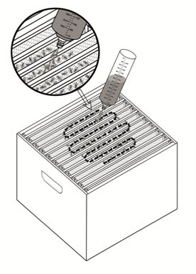 administrare în stup. Aplicați produsul la albine în culoarele dintre rame ale corpului cuibului . Asigurați-vă că albinele tratate au acces suficient la apă potabilă.