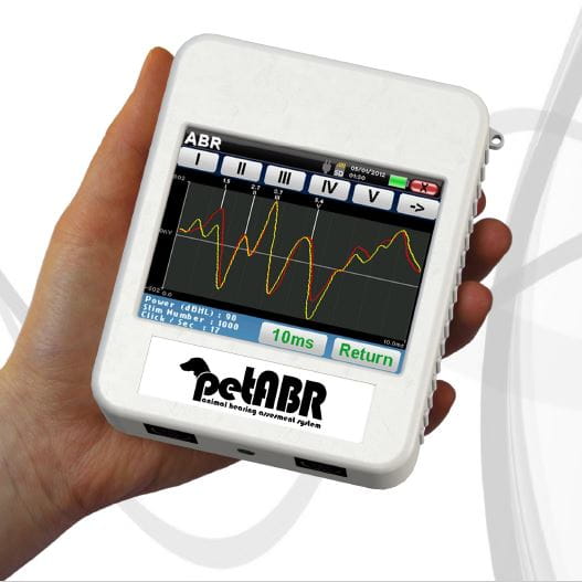PetABR este un aparat inovator de testare a auzului la animale bazat pe metoda potențialului evocat de trunchiul cerebral, cunoscut și sub numele de ABR (Auditory Brainstem Response) sau BAER (Brainstem Auditory Evoked Response). Acesta oferă teste auditive precise și eficiente la o varietate de specii de animale. Designul său modern și compact îi permite să fie utilizat atât în biroul staționar, cât și în timpul examinărilor mobile pe teren.