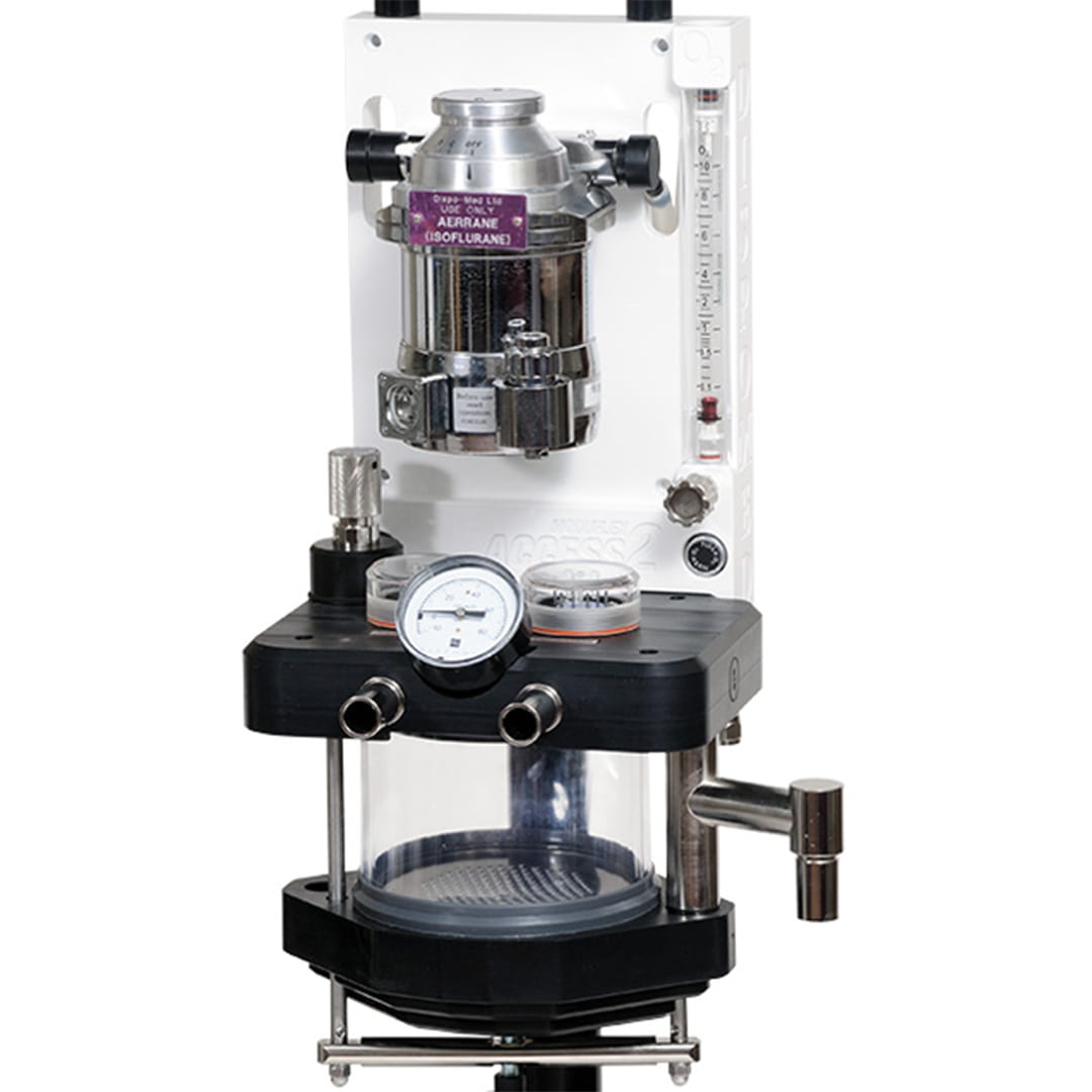 Aparatul de anestezie pentru animale prezentat este mobil, deplasându-se prin intermediul unui suport pe cinci roți.