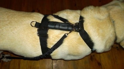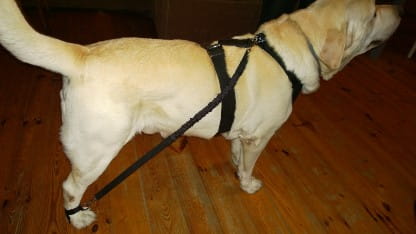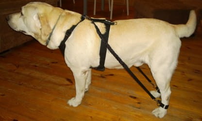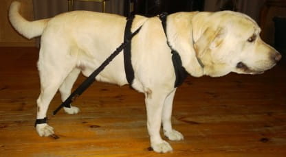 Câinele trebuie să aibă hamul de umăr cu un cerc la înălțimea crupei câinelui.