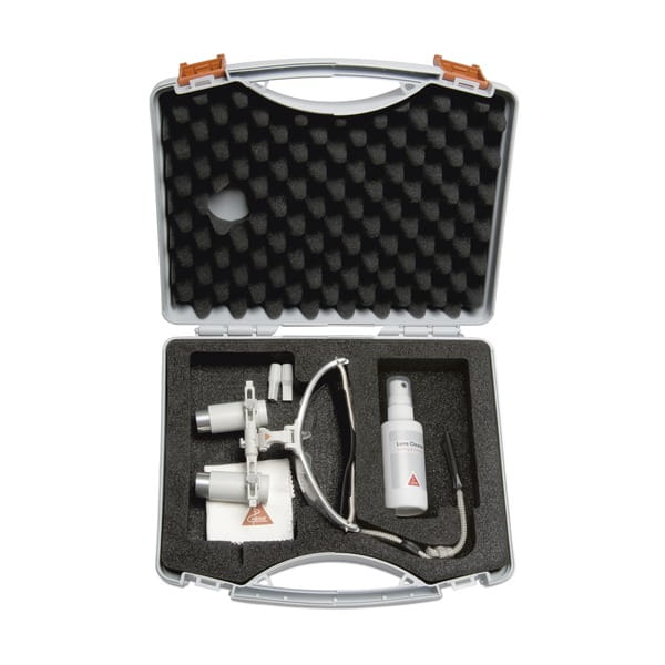 Împreună cu lupa sunt incluse oculare de protecție, 2 pârghii pivotante sterilizabile, curea de fixare, lichid de curățare, cârpă de curățare și geantă de transport. Aceste articole suplimentare oferă un set complet de accesorii de care ați putea avea nevoie atunci când utilizați lupa binoculară HEINE HRP.