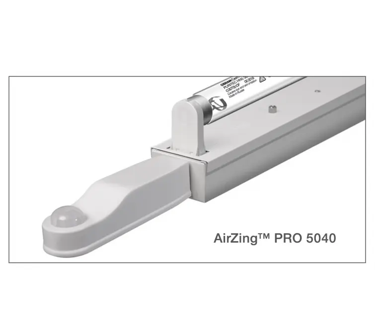 Corpurile de iluminat speciale AirZingTM PRO sunt echipate cu lămpi fluorescente germicide (HNS 36W sau HNS 30W), care emit radiații UV-C cu o lungime de undă de 253,7 nm. Această radiație dezinfectează eficient aerul, apa și suprafețele și este complet absorbită de oxigenul și ozonul din atmosferă.