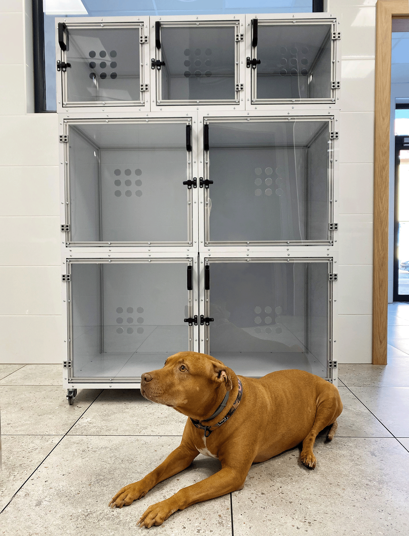 - Cușcă echipată cu roți pivotante cu frâne;